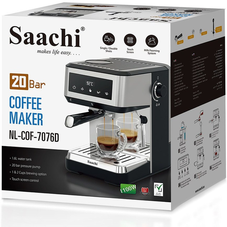 دستگاه اسپرسوساز Saachi NL‑COF‑7076D با پمپ فشار ۲۰ بار و توان ۱۱۰۰ وات طراحی شدهاست تا قهوهای غنی و حرفهای در خانهی شما آماده کند.