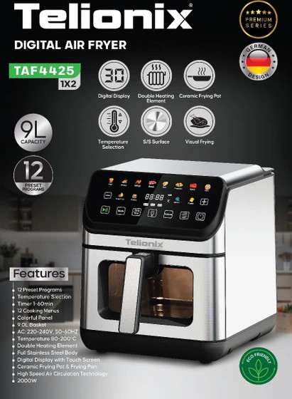 سرخکن بدون روغن Telionix TAF4425 با ظرفیت بزرگ ۹ لیتر و توان ۲۰۰۰ وات، انتخابی حرفهای برای پخت سالم و سریع غذاست. این دستگاه با گردش سریع هوای داغ، امکان سرخ کردن گوشت، سبزیجات یا سیبزمینی را بدون نیاز به مقدار زیادی روغن فراهم میکند.