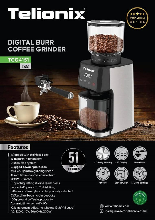 آسیاب قهوه تلونیکس مدل 4151 با تیغه استیل ضد زنگ، توان ۲۰۰ وات و تنظیم درجه آسیاب، دانههای قهوه را بهصورت یکنواخت و سریع آسیاب میکند. مناسب استفاده خانگی و کافیشاپ کوچک، با لرزش و صدای کم.
